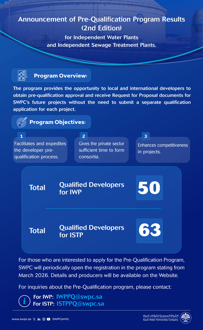 Saudi Water Partnership Company (SWPC) is pleased to announce the results of the “Second Edition of the Pre-Qualification Program” which was re-opened in March 2025. The program attracted over 60 interested developers aiming to be qualified for SWPC’s upcoming projects.